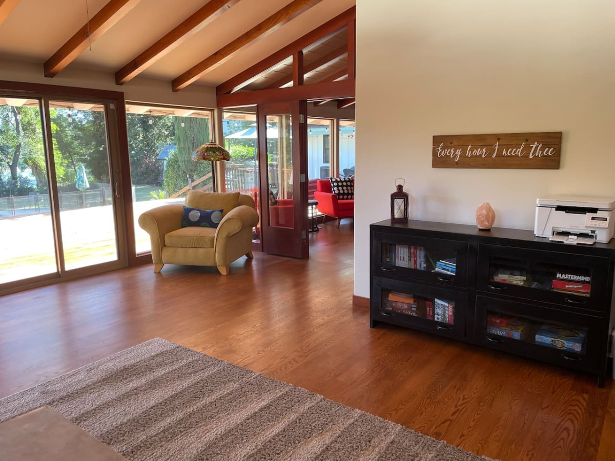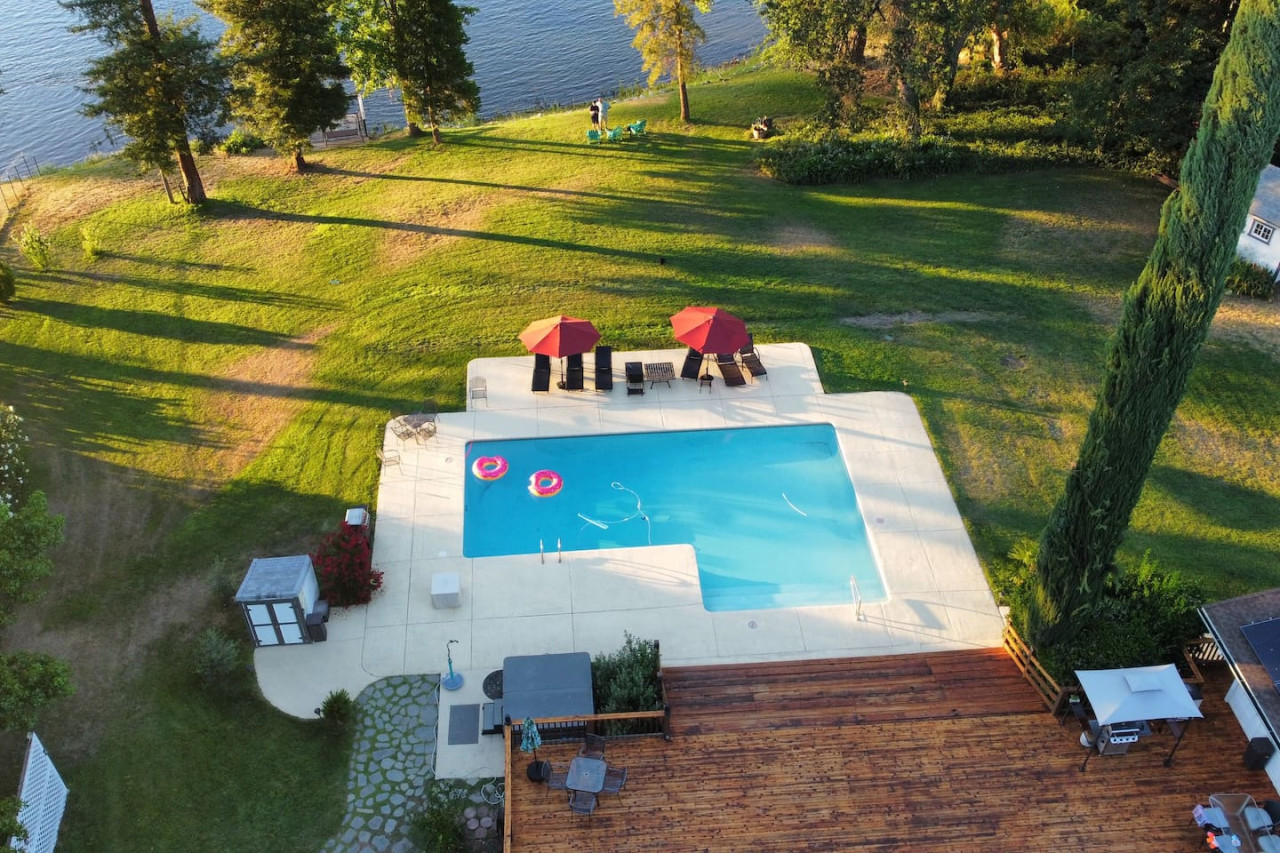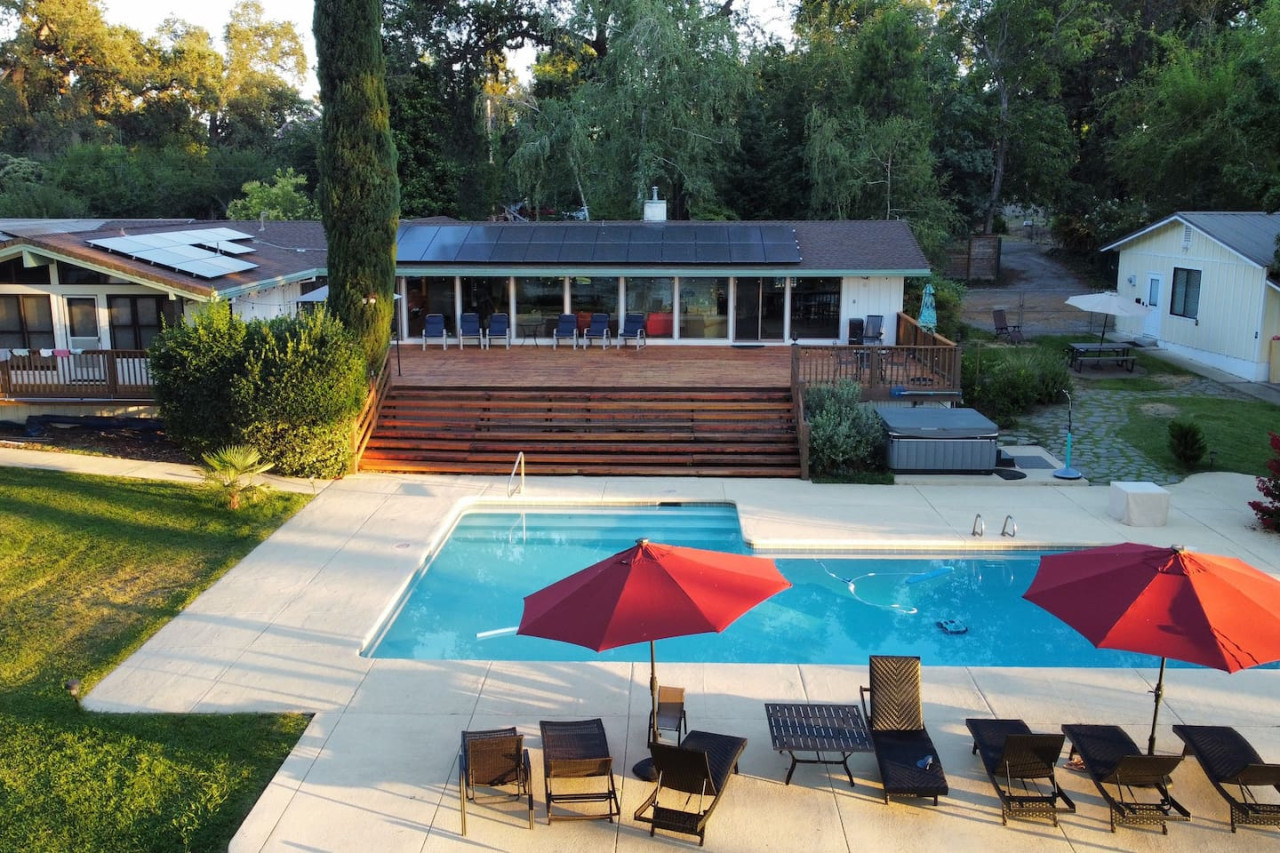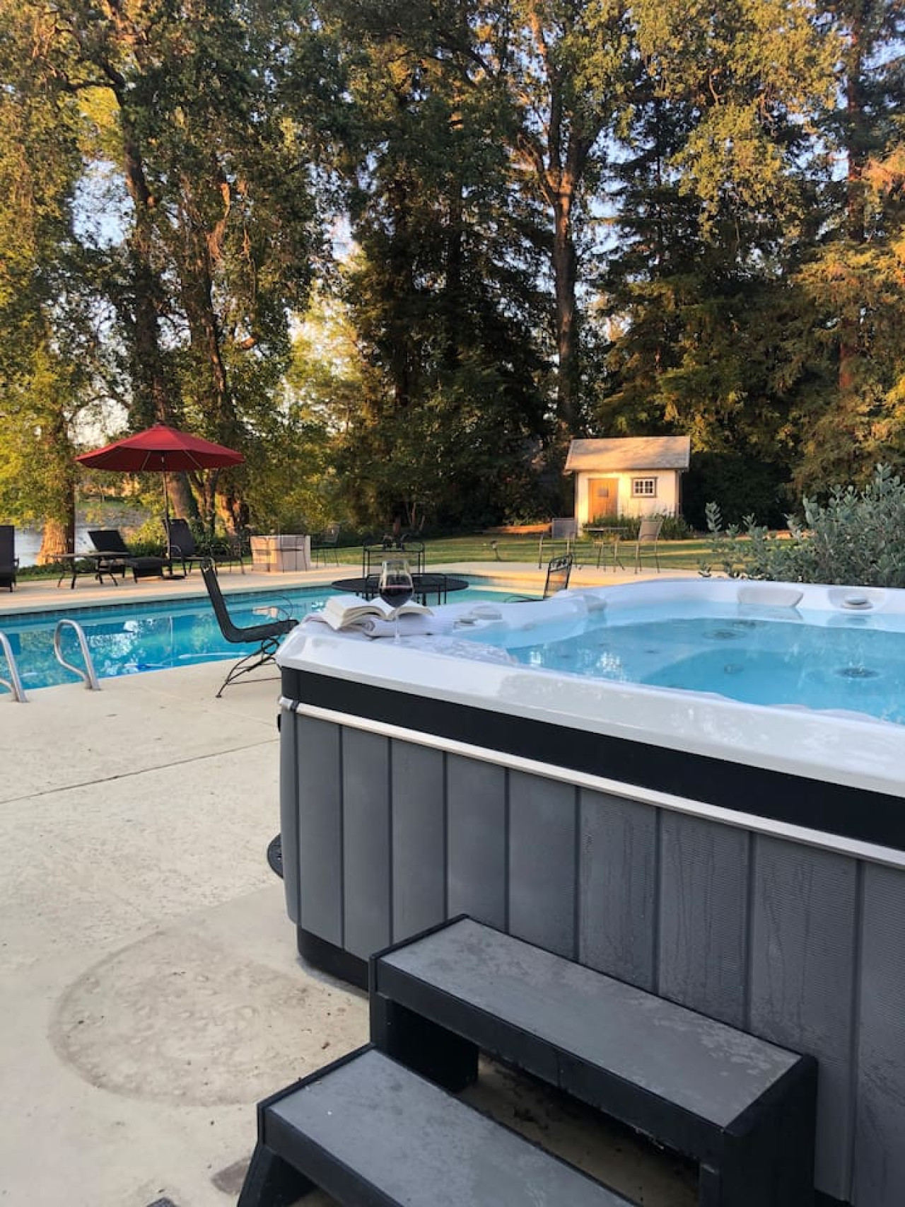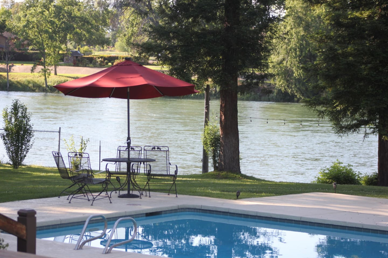 Make memories as you connect with friends and loved-ones at this beautiful Riverside Estate. Relax in the 6 person hot tub, swim in the massive pool, or enjoy fishing on the Sacramento River. Then get together on the deck for an amazing barbecue and good times. Sleep in one of the 10 beds, or watch a show in front of the fireplace. There’s even two cottages, you could slip away to if you need a little bit more privacy. In the morning, you’ll enjoy preparing breakfast in our executive kitchen.